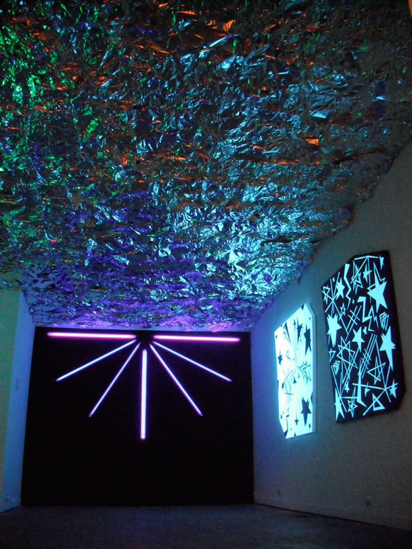 Ben Furgal, an interdisciplinary artist and co-director of Magic Pictures, presents a show inspired by the night sky. For the installation, the entire ceiling of Magic Pictures was covered with ruffled tinfoil and illuminated by a configuration of blacklights, reflecting the light from the blacklights and the glow of the paintings themselves.